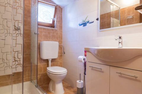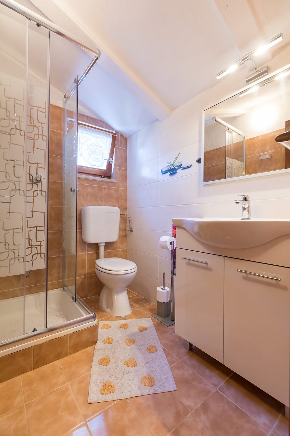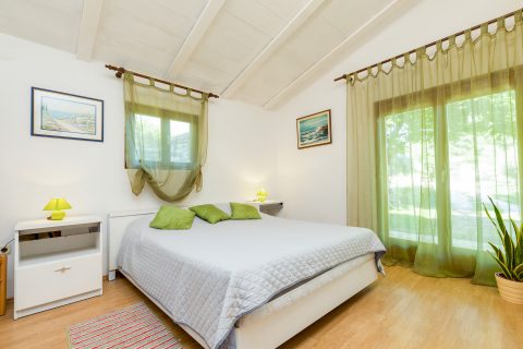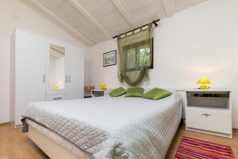 Apartman-kućica u vrtu je izoliran od ostalih apartmana, te je smješten zasebno u vrtu sa vlastitim parkingom. Sastoji se od vlastite terase, kuhinje s blagavaonom, dnevnog boravka, kupaone, spavaće sobe s bračnimm krevetom te zasebne spavaće sobe s dva odvojena kreveta na galeriji. Apartman je opremljen klima uređajem, smart TV-om i pristupom internetu. Gostima je uz apartman omogućenima besplatan parking, pristup dvorištu, sadržajima za djecu i zajedničkom bazenu.